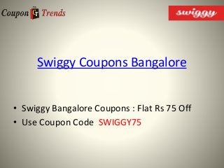 Swiggy Coupons - Flat Rs 75 OFF on First Order for Jul 2022 Comments (0) Valid Till Jul 31, 2022. Coupon/Offer Details. ×. Get 50% off upto Rs.100 on your first order online from swiggy. Minimum order value is not required. Don't forget to use the coupon code while checkout for the payment. Valid on all payment methods. Offer valid on only on App orders.