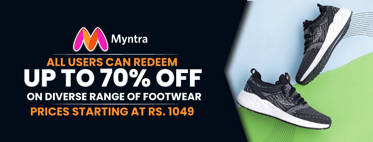 Myntra Coupons For Shoes | September 2022 - Zoutons Myntra First Order Coupon Code will give you Rs.500 off on shoes. Myntra Discount Codes For Kids Shoes | Max. 70% Off Today, Myntra is giving away an instant 70% off on the entire collection. You can participate in this benefit raising your kids favorite shoes demands. Get shoes from the Brands like Nike, Asics, Red Tape and a lot more.
