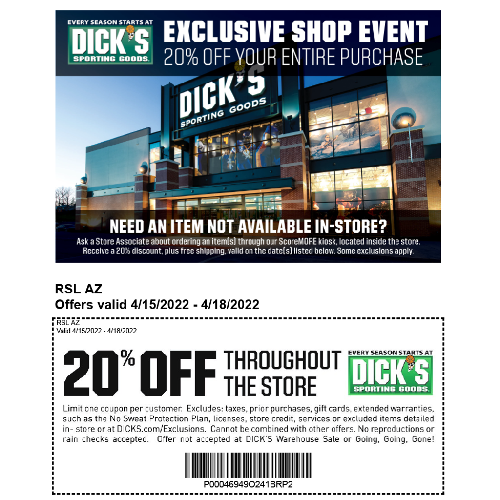In-Store Coupons for DICK'S Sporting Goods Golf Equipment & Apparel. Outdoor Gear. Shop all DICK'S Sporting Goods coupons and offers and save big on sports apparel, footwear and equipment for every athlete. Check out this week's deals for great seasonal sales and limited-time savings. Plus, don't miss out on last-chance offers on DICK'S clearance products. Dick's Sporting Goods Discount | 15% Off + 50% Sale | 2022 Shop $20 off with Text Alerts at Dick's Sporting Goods Use Coupon Valid until 12/31/2022 Terms & Conditions 10% COUPON Receive 10% off with Newsletter Sign Up at Dick's Sporting Goods Use Coupon... Dick's Sporting Goods Promo Code September 2022 - Active 30% Coupon & Sale DICK'S Sporting Goods September 2022 Official Promo Code, Coupons & Deals. From indoor and outdoor sporting goods to the latest sneakers for men, women, and kids, and everything in between, DICK'S Sporting Goods has everything you need. Save some cash by checking out their official coupon codes, promo discounts, and their latest sales event!